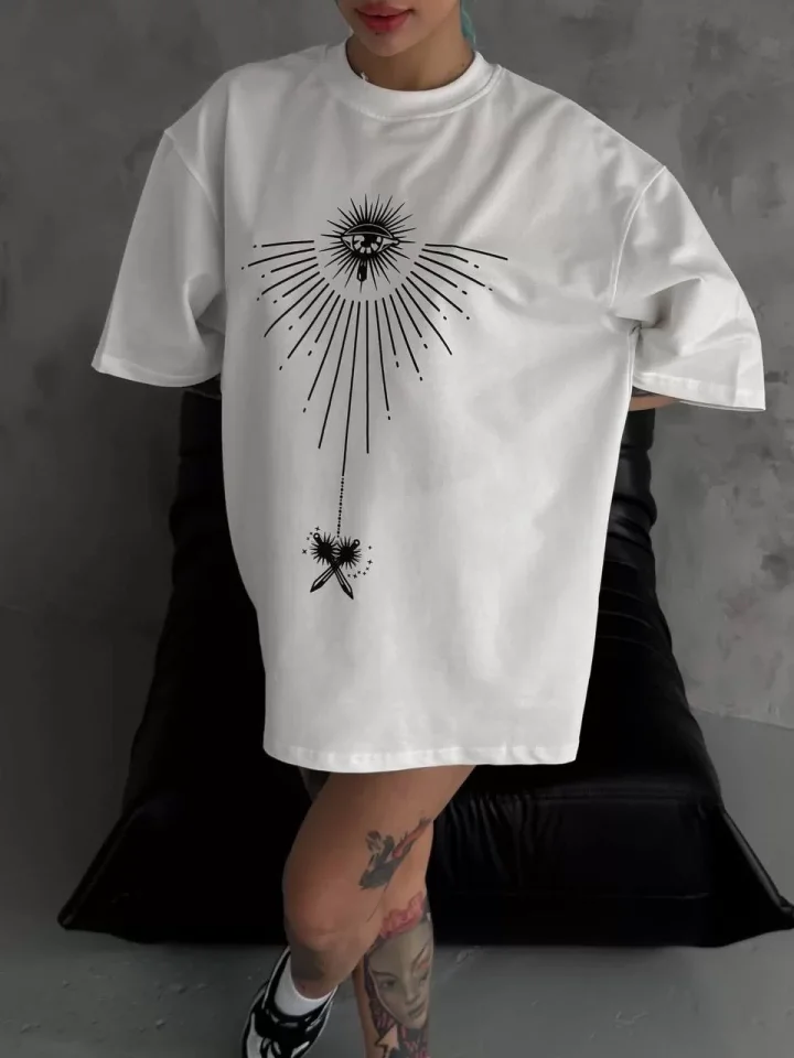 Unisex Bisiklet Yaka Baskılı Oversize T-Shirt – Beyaz