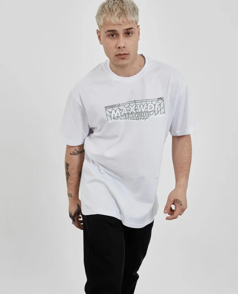 Unisex Bisiklet Yaka Baskılı Oversize T-Shirt – Beyaz