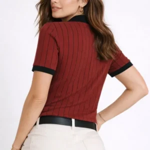 Polo Yaka Çizgili Tişört Kısa Kol Düğmeli Yazlık T-Shirt – Bordo