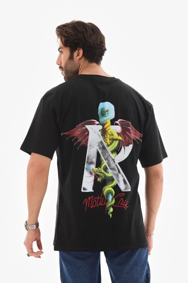 Unisex Bisiklet Yaka Baskılı Oversize T-Shirt – Siyah