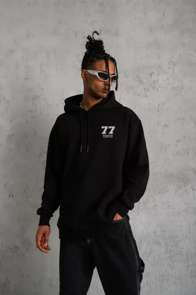 Unisex Kapşonlu Baskılı Sweetshirt – Siyah