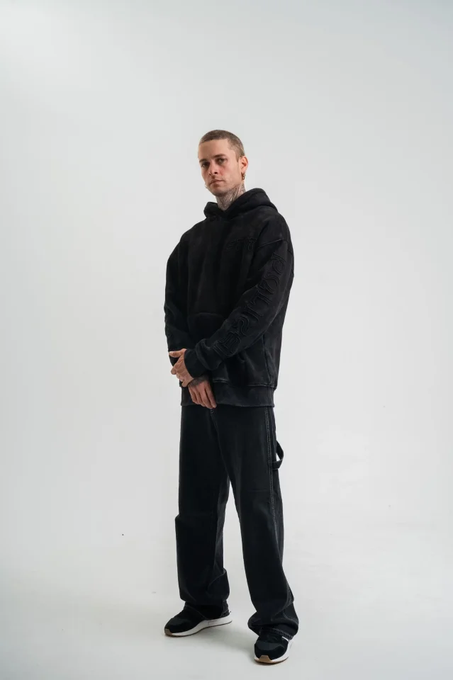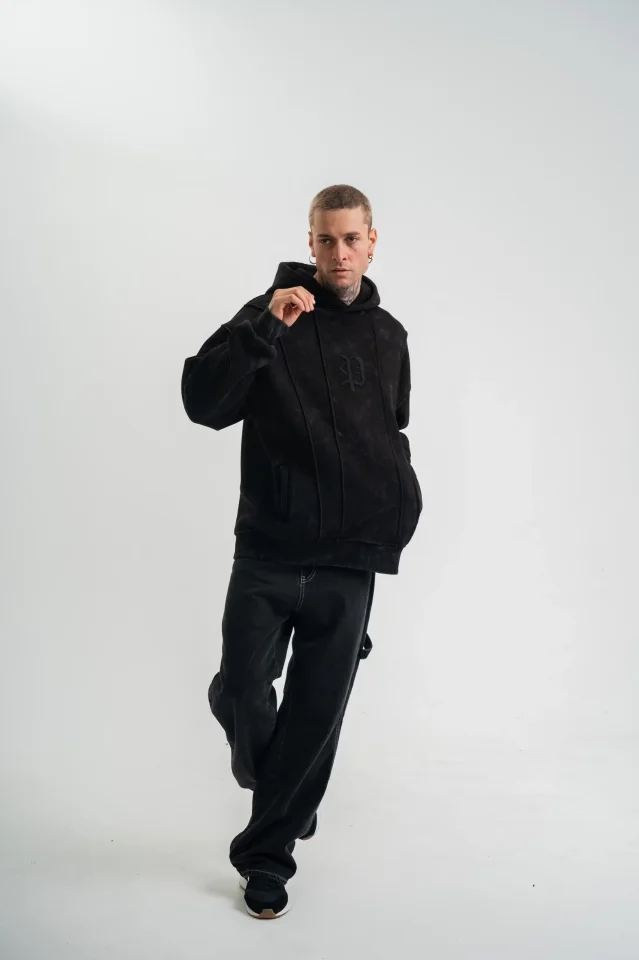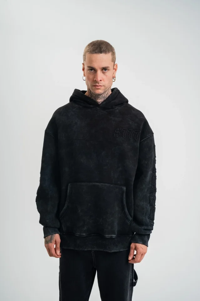 Unisex Uzun Kol Kapşonlu Yıkamalı Nakışlı SweatShirt – Siyah
