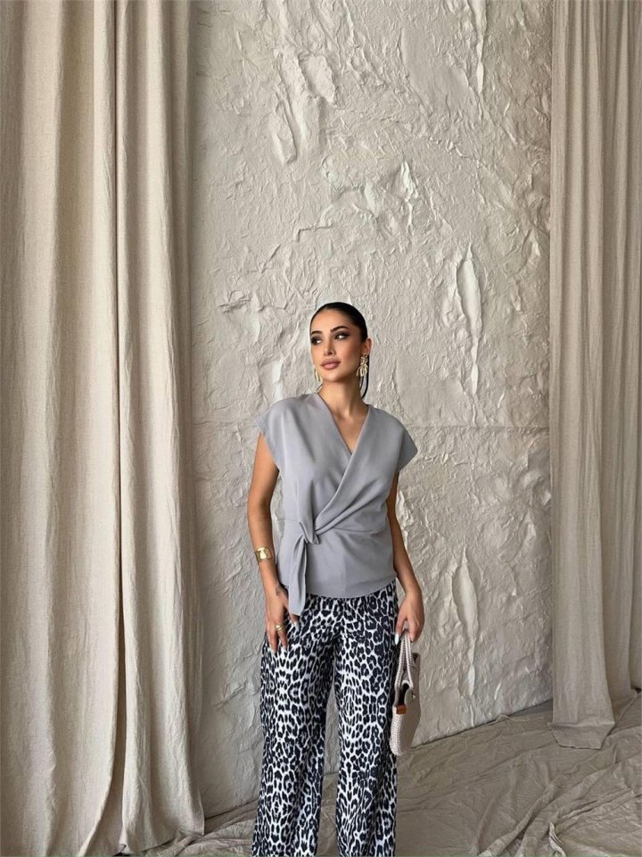 YANDAN BAĞLAMA DETAYLI KOLSUZ BLUZ – Gri