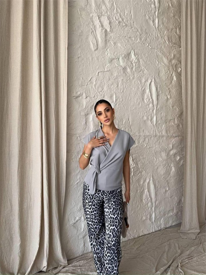Kadın Kısa Kollu Asimetrik Kesim V Detaylı Leopar Desenli Viskon Bluz