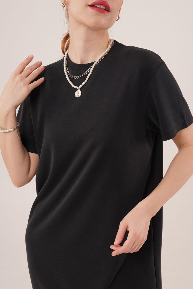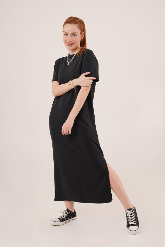 Yırtmaç Detaylı Kısa Kollu Salaş Maxi Siyah Elbise Modelin Ölçüleri: Boy:165, Kg:55, Göğüs:90, Bel:72, Kalça: 100 Modelin üzerindeki ürün M/38 bedendir